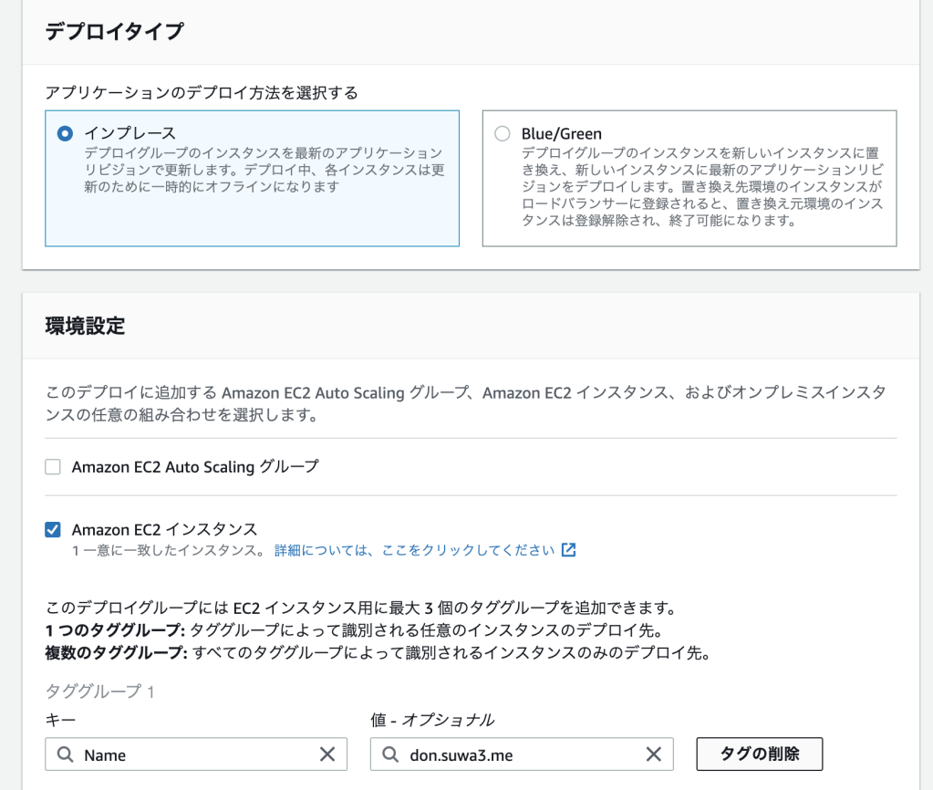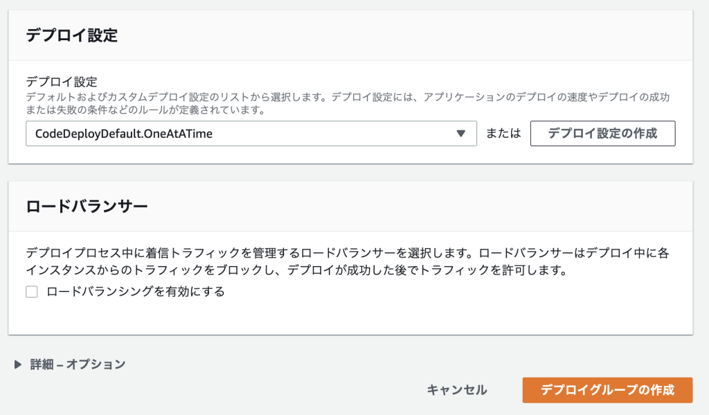 デプロイ設定は、今回ES2インスタンス1台なのでOne at Timeを選択します。
